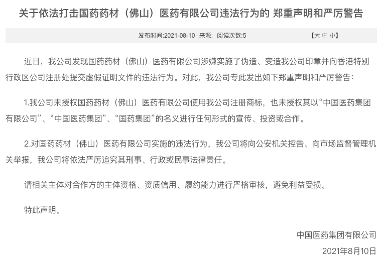 8月10日,国药集团官网发布声明称,近日,我公司发现国药药材(佛山)医药有限公司涉嫌实施了伪造、变造我公司印章并向香港特别行政区公司注册处提交虚假证明文件的违法行为。我公司未授权其使用我公司注册商标,也未授权其以“中国医药集团有限公司”、“中国医药集团”、“国药集团”的名义进行任何形式的宣传、投资或合作。对其实施的违法行为,我公司将向公安机关控告、向市场监督管理机关举报,我公司将依法严厉追究其刑事、行政或民事法律责任。