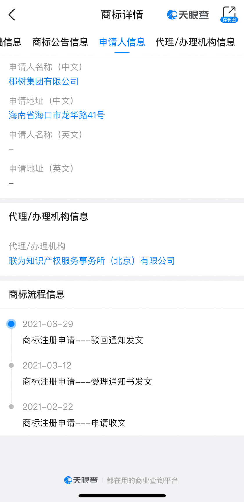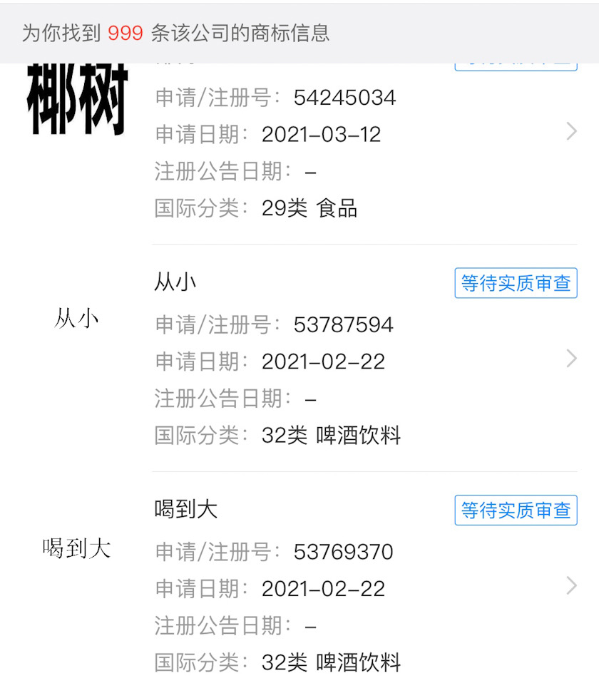除“从小”、“喝到大”商标外,椰树集团不久前也在申请“国宴饮料”商标上再度翻车。
