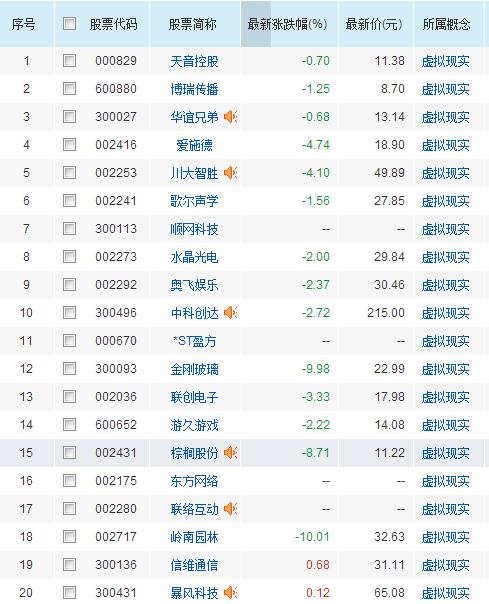 多只虚拟现实概念股出现不同幅度的下跌