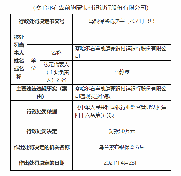 银保监会官网8月11日消息,据乌兰察布银保监分局行政处罚信息公开表,察哈尔右翼前旗蒙银村镇银行股份有限公司因违规发放贷款,被罚款50万元。