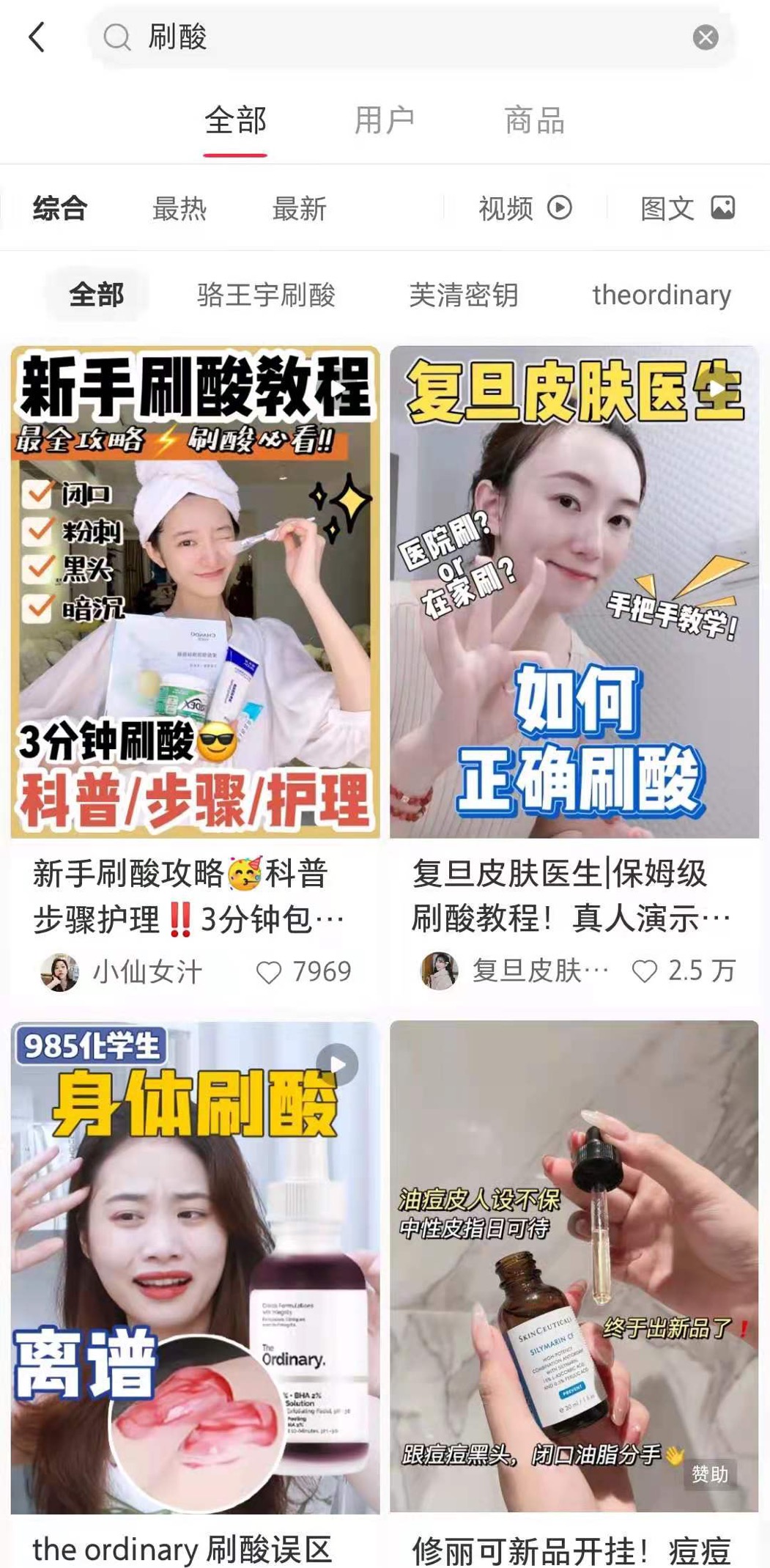“刷酸”是目前很流行的一种美容词汇,打开小红书搜索“刷酸”,能找到超过20万条笔记分享,提到“刷酸”具有美白、祛痘印等功效。被称为“刷酸一哥”的骆王宇,在各大社交平台上分享“刷酸”经验,更是收获了全网共计1000多万的粉丝。