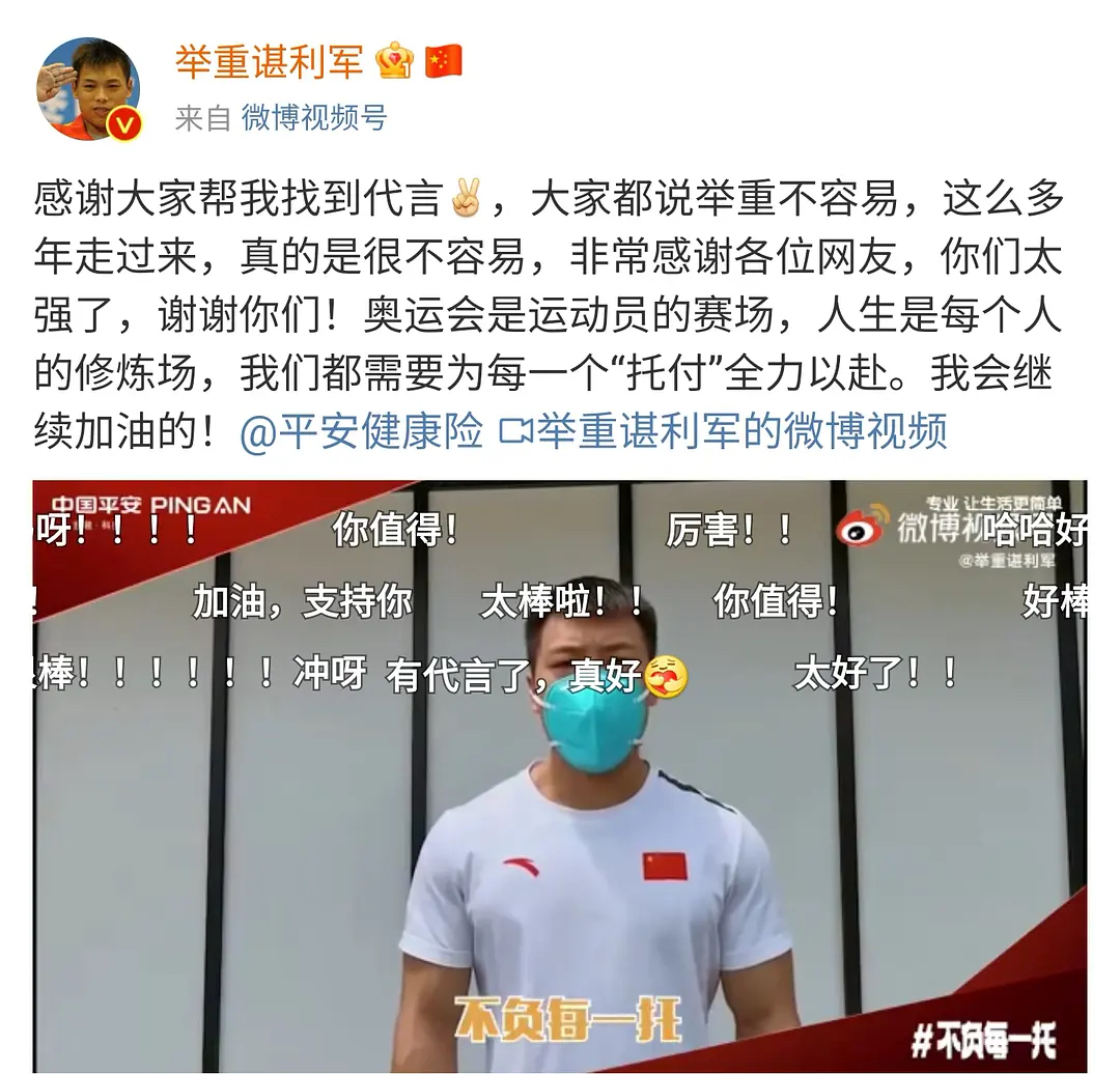 这也考验品牌的反应速度。在夺得奥运会男子67公斤级举重金牌后的短短5天时间里,被网友操心关注度太低的谌利军,获得了平安健康险的签约,并在微博表示“感谢各位热心网友帮我找代言”。