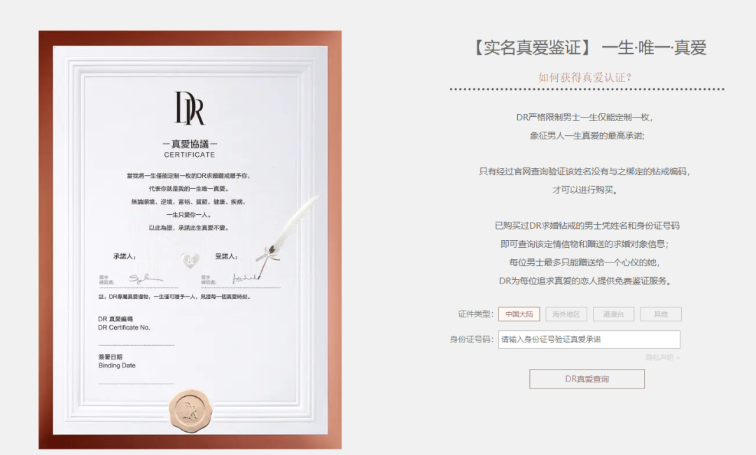 具体来说,在购买DR求婚钻戒时,消费者需要签署真爱协议,通过身份证件进行信息绑定,一生仅可购买一次DR钻戒、赠予唯一受赠人。