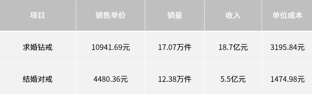 其中,镶嵌钻石主石的求婚钻戒因为单价较高,又比使用碎钻的结婚对戒贡献了更多的收入。