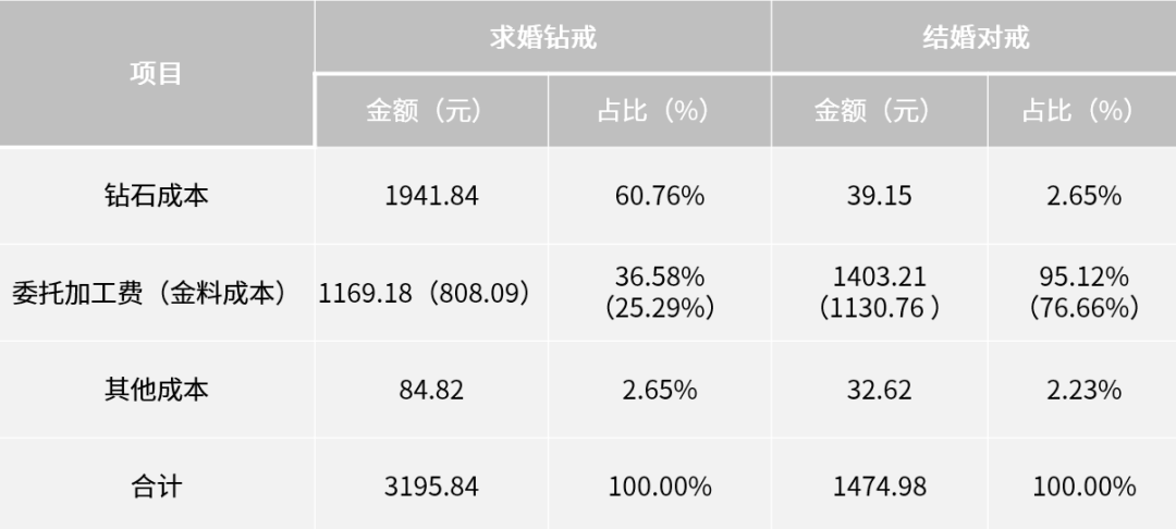 也就是说,消费者花10941元购买求婚钻戒,其中钻石的成本为1941元,设计加工的成本为1169元;而花费4480元购买结婚对戒,钻石成本仅为39元,设计加工成本为1402元。