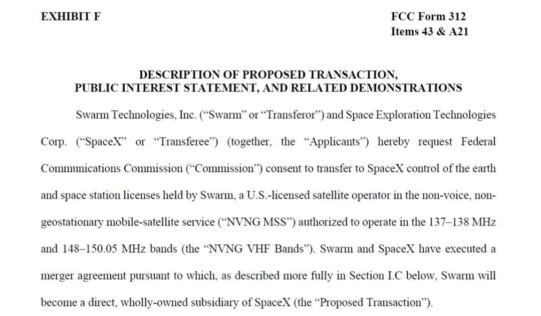 收购消息来源于8月6日Swarm向美国联邦通讯委员会(FCC)提交的一份文件。文件显示,SpaceX和Swarm已在7月16日签署了相关协议,Swarm成为前者的全资子公司。文件中,Swarm还申请将其所有FCC许可证转让给SpaceX。