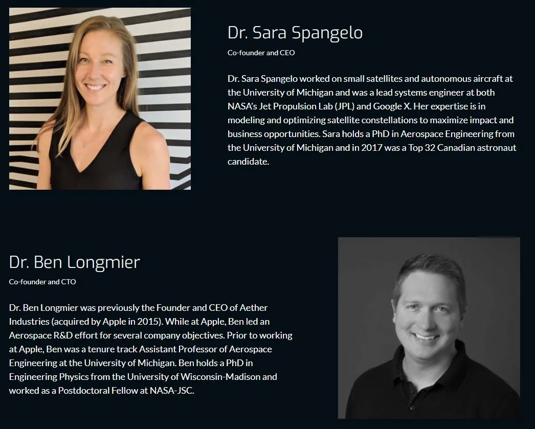 另一位创始人Ben Longmier兼CTO也曾在密歇根大学任教,是该校航空航天工程专业终身助理教授。2015年,他将自己创办的临近空间气球探测公司Aether Industries卖给了苹果公司。同时他还是 Apollo Fusion 公司的联合创始人,这家公司的业务也是围绕着太空展开,主要为人造卫星提供新型电推系统。