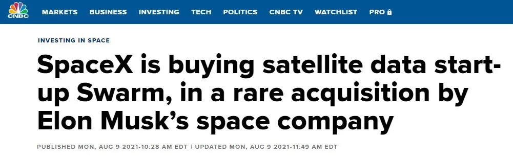 SpaceX的第5次对外投资,也是其成立以来的第一次全资收购,就是对Swarm的收购。