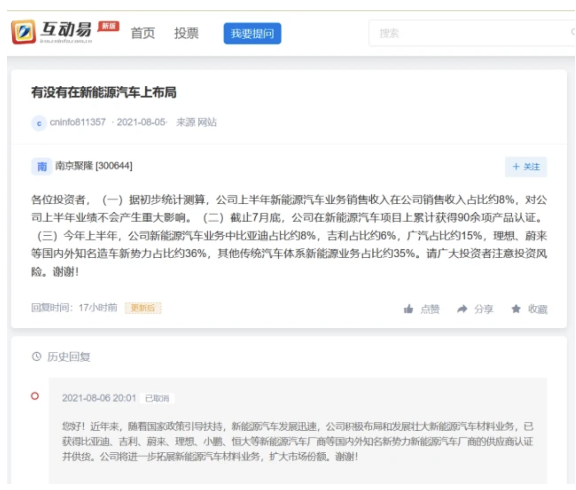 今年8月6日(上周五),南京聚隆在互动易回复投资者关于公司是否在新能源汽车上布局时提及,“公司积极布局和发展壮大新能源汽车材料业务,已获得比亚迪、吉利、蔚来、理想、小鹏、恒大等新能源汽车厂商等国内外知名新势力新能源汽车厂商的供应商认证并供货。”