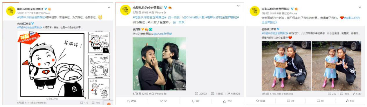 从目前来看,邓超及其工作室,无疑是这部影片最卖力宣传者。《从你的全世界路过》的官方微博从5月5日开通,目前为止大部分微博均转发自邓超及其工作室。