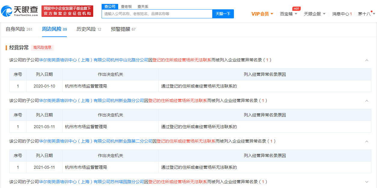 值得一提的是,数家华尔街英语分公司目前已被列入企业经营异常名录,其原因为“通过登记的住所或者经营场所无法联系的”。