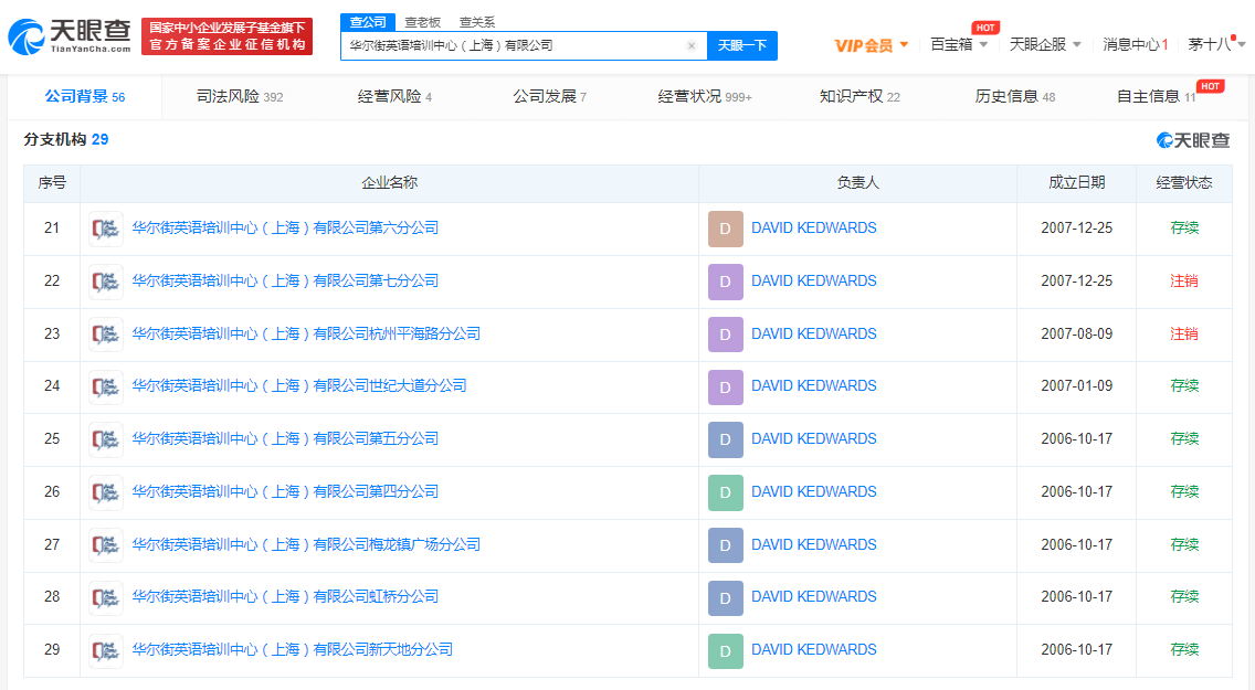 据天眼查APP显示,华尔街英语品牌关联公司为华尔街英语培训中心(上海)有限公司,成立于2005年7月,注册资本5100万人民币,法定代表人为David Kedwards,经营范围含英语培训,提供相关的培训咨询。股东信息显示,该公司最大股东为香港伽玛-马斯特有限公司。