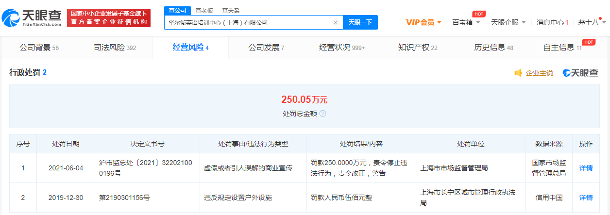 天眼查APP显示,华尔街英语涉及数十起法律案件,案由包括教育培训合同纠纷、服务合同纠纷、劳动合同纠纷等。2021年6月,该公司因“虚假或者引人误解的商业宣传”被上海市市场监督管理局罚款250万,并责令改正。