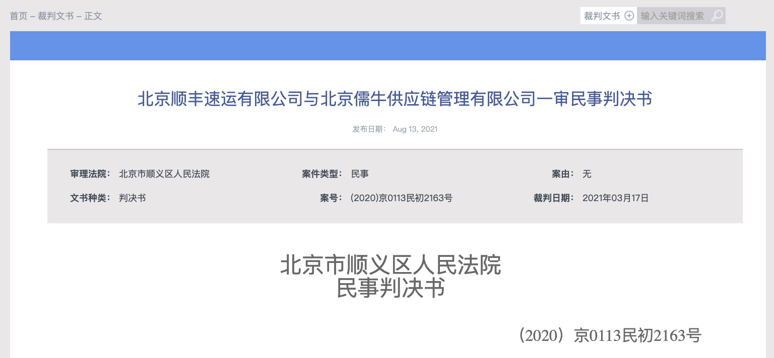 据天眼查APP显示,8月13日,北京法院审判信息网公开北京顺丰速运有限公司与北京儒牛供应链管理有限公司一审民事判决书。