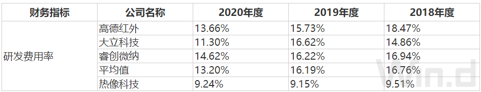 在销售费用率大幅高于同行的情况下,热像科技研发费用率远低于行业平均值水平。2018至2020年,公司研发费用分别为577万元、701.13万元和2042.28万元。对此,热像科技给出的解释是受限于经营规模和资金实力,公司集中资源投入在部分主要研发项目上,未来随着公司实力不断增强,将持续加强对于研发的资源投入。在市占率和企业规模都在行业内不占优情况下,研发投入比也低于行业平均线,热像科技的核心竞争力究竟在哪?