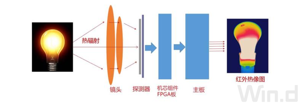 红外热像仪由红外镜头、探测器、机芯板、主板以及其他辅助配件与接口组成,通过红外镜头接收目标物体的红外辐射,然后经过探测器的光电转换和后端电路的电信号处理及数字图像处理等手段,将目标物体的红外辐射强弱分布图像转换成视频图像,提供不同的用户交互方式来进行展示。