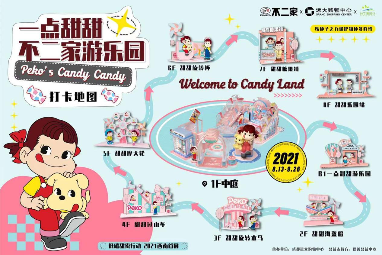 2021年8月13日-9月26日,西南首个不二家大型环保甜蜜主题展“一点甜甜,不二家游乐园”正式登陆成都远大购物中心,在这个夏天奖励低碳环保的你,传达来⾃不⼆家的专属甜蜜⼒量!