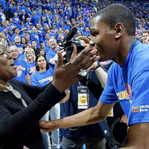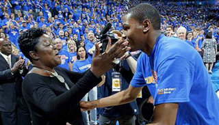 完达·杜兰特:他有他的教练来进行训练。我会在工作下班后,来到训练场。教练会要求他可能做25个冲刺,25个上篮,而我就会轻松地说,“不,我认为你需要做75个。”现在想起来,这就像是在我进来之前,他什么都没有训练一样。我会当做他刚刚开始训练,然后认为他完成那些任务没有问题。但是,有时候我也会想,“我可能有点残忍。”但是,这也是他训练的一部分。