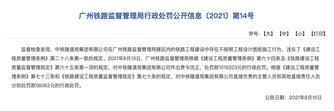 国家铁路局网站消息,8月16日,广州铁路监督管理局发布的行政处罚公开信息显示,监督检查发现,中铁隧道局集团有限公司在广州铁路监督管理局辖区内的铁路工程建设中存在不按照工程设计图纸施工行为,违反了《建设工程质量管理条例》第二十八条第一款的规定。2021年8月13日,广州铁路监督管理局根据规定,对中铁隧道局集团有限公司作出责令改正,处罚款1019323元的行政处罚。根据规定,对中铁隧道局集团有限公司直接负责的主管人员和其他直接责任人员分别处罚款56062元的行政处罚。