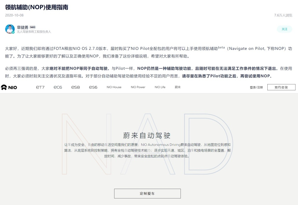 对此,蔚来方面回应,NOP并非自动驾驶,仅为领航辅助功能。