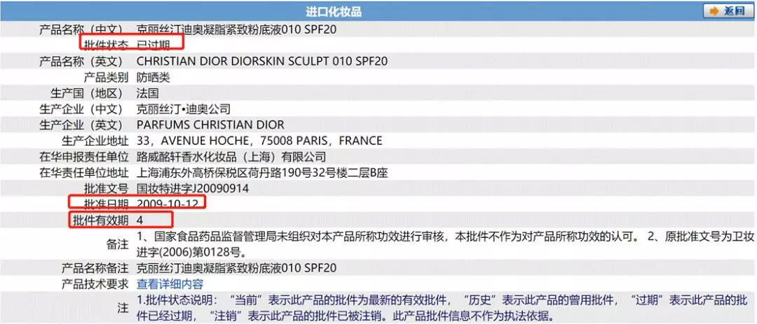 更值得注意的是,“国妆特进字J20090914”对应产品的批准日期为2009年10月12日,有效期显示为4年。对此,有行业工程师告诉青眼,“2013年后,该产品就不能生产。如果产品是在最后有效批准期2013年生产的,以大部分产品三年保质期计算,那这款产品过期已长达5年。”