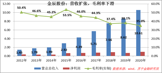 从财务数据上看,2012-2020年,公司营收从1.45亿增至10.61亿,复合增速28.2%;净利润从0.37亿增至0.97亿,复合增速12.8%。利润增速低于营收增速,原因在于公司毛利率呈下滑趋势。