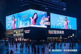 同样的,与之相媲美的还有重庆的“3788亚洲之光”裸眼3D大屏,地处重庆观音桥商圈中心位置,围绕苏宁易购大楼两面搭建而成。总面积高达3788㎡、分辨率为8K的超高清LED显示屏,被称之为“亚洲第一屏”,由东方初晓传媒运营,利亚德集团所承建,整块显示屏兼顾建筑美学与商圈环境融为一体,其大跨度、高精度的屏幕保证了行人的视野时刻处于最佳观看区域,带给大众更具沉浸式的体验,使得城市夜间景观层次更为丰富。