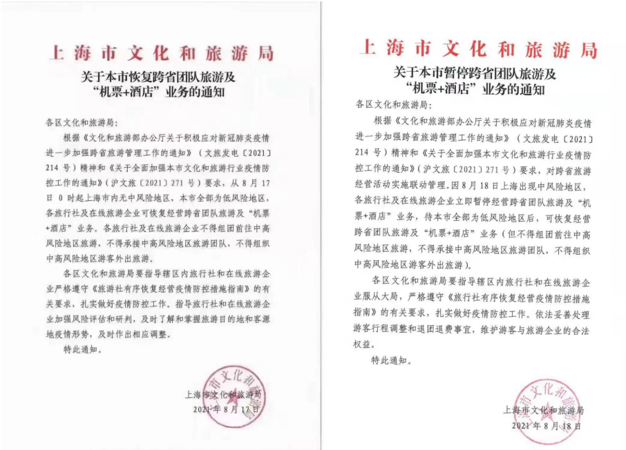 随即,上海市文化和旅游局又宣布暂停上海市各旅行社及在线旅游企业的跨省团队旅游及“机票+酒店”业务。