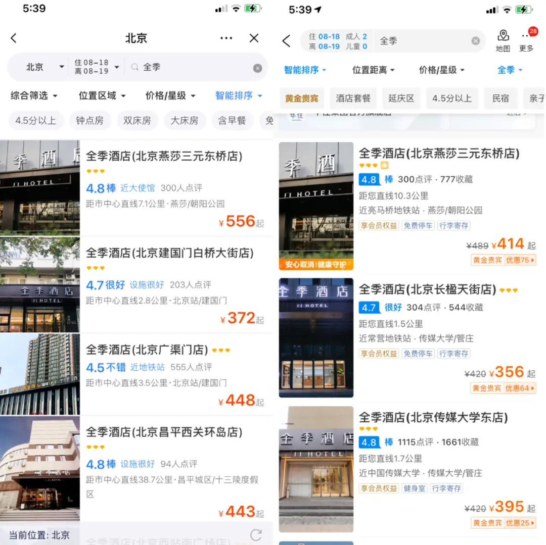 经一刻商业体验发现,在抖音九宫格中,定位北京,搜索全季酒店某门店,价格为每晚556元起。同等条件下,携程App价格为414起,抖音价格贵了150元左右。此外,在同等条件下,北京飞往上海的机票价格与同程旅行小程序保持一致。