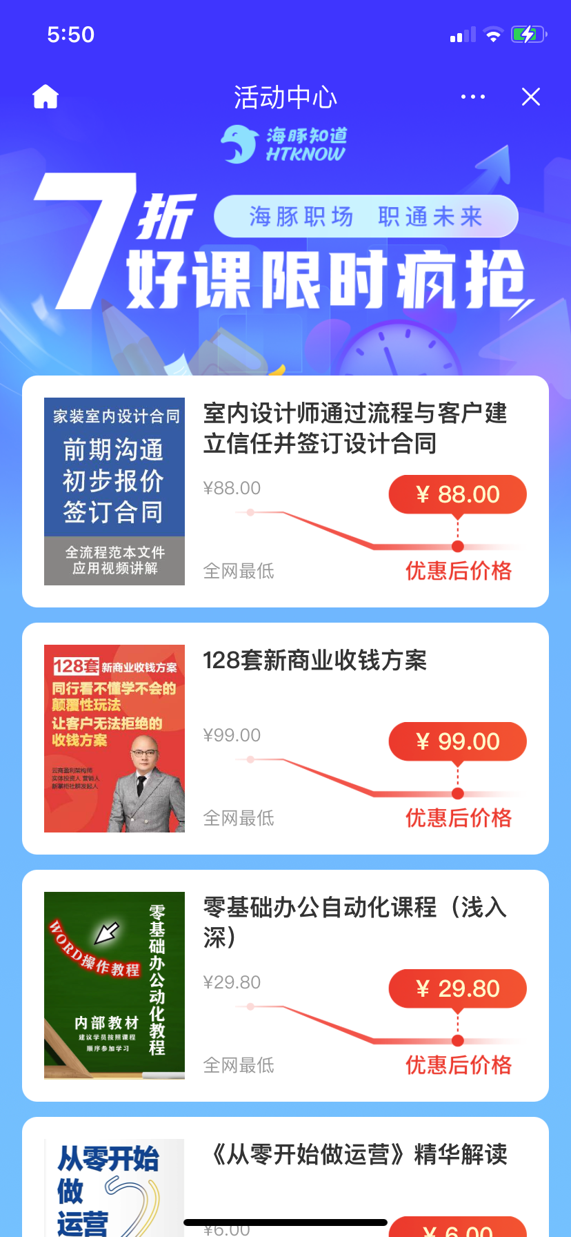 简单来讲,由抖音首款知识付费小程序“海豚知道”提供服务,包括运营课、视频制作课、摄影课等。该界面显示,所有课程均为7折抢购,为全网最低价。