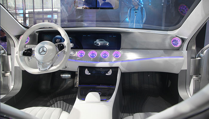而奔驰的IAA主要强调空气动力学的表现,从而在在驾驶层面并没有引入F015上那么强烈的概念,但是IAA也比较接地气,内饰的设计布局与现款的S级很接近,4门4座的设定以及中控台上两块12.3英寸的屏幕几乎囊括了车内一切从能的控制,全新的COMAND系统让用户可以通过手势来控制两个屏幕,一个用来实时显示发动机信息,另外一个用来控制空调系统。当然这也不是什么新鲜科技了,在新款的宝马7系上已经运用了。