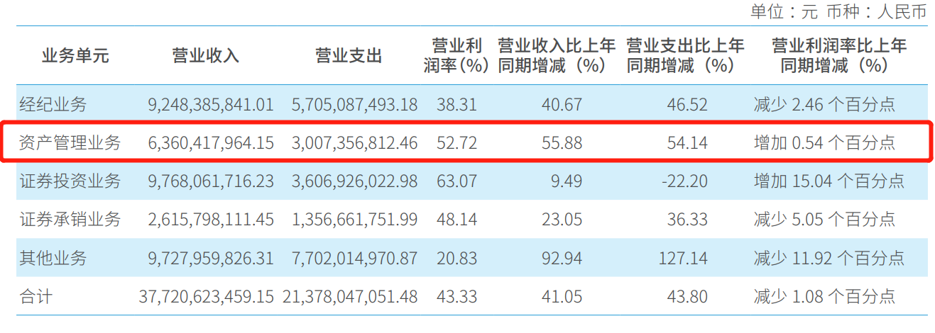 分业务来看,各项业务单元的营业收入均有所增长。其中,除其他业务之外,资产管理业务是营收增长幅度最大的一项,上半年实现营业收入63.60亿元,同比增长55.88%,营业利润率52.72%,比上年同期增加0.54个百分点。