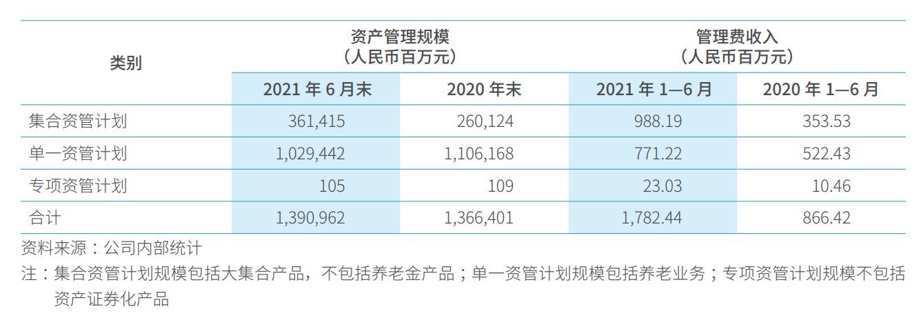 截至报告期末,公司资产管理规模合计1.39万亿元,同比减少2.31%,包括集合资产管理计划、单一资产管理计划及专项资产管理计划,规模分别为3614.15 亿元、10294.42 亿元和 1.05 亿元。