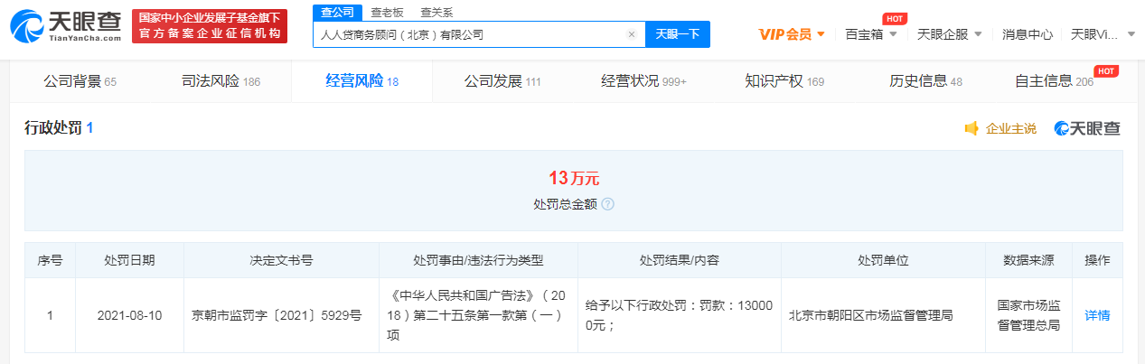 据天眼查APP显示,近日,人人贷商务顾问(北京)有限公司新增行政处罚,处罚事由为违反广告法相关条款(发布包含投资类广告暗示无风险的文字表述),处罚结果为罚款13万元。处罚单位为北京市朝阳区市场监督管理局。