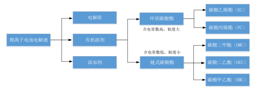锂电池电解液主要由溶剂、添加剂和电解质组成,其中电解液溶剂占电解液质量的80%左右,成本的22%-28%,是电解液的主要原材料,按其结构的不同,主要分为环状碳酸酯类有机溶剂、链状碳酸酯类有机溶剂。环状碳酸酯类溶剂包括碳酸乙烯酯(EC)和碳酸丙烯酯(PC),EC相对于PC而言,化学稳定性更高、相对介电常数更大,循环性能更佳,因此应用范围相对较广。链状碳酸酯类溶剂包括碳酸二甲酯(DMC)、碳酸二乙酯(DEC)和碳酸甲乙酯(EMC)等,DMC气味小、溶解能力强,对锂电池的电导率提升效果高,低温充放电性能佳,且制作成 本低廉,是电解液中使用最为频繁的有机溶剂。