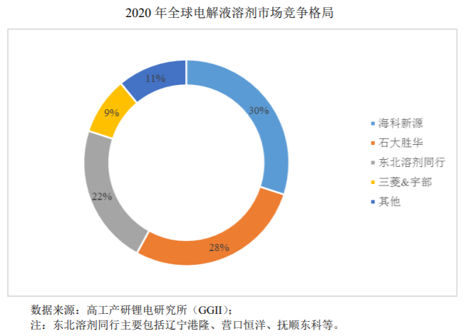 据招股书中引用的GGII(高工产研锂电研究所)数据显示,2020年全球溶剂市场需求量为28.5万吨,同比增长31.7%,中国溶剂市场需求量为20.7万吨,同比增长33.5%,在2020年全球电解液溶剂市场,海科新源市场占比30%,石大胜华市场占比28%,两者市场份额占比超55%,市场呈现双寡头竞争格局。