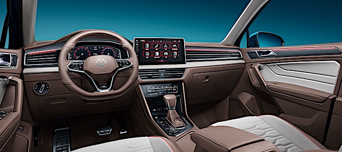 在车舱内部,新车的装饰风格也经过全新设计。新车搭载全新12英寸悬浮式中控屏,具有智能语音、隔空手势、触摸控制等功能,同时集成智能在线实时导航、车辆设置、拨打电话等操作。此外,新车还提供10.3英寸全数字液晶仪表、全新R-Line专属真皮多功能方向盘、30色LED环境氛围灯、哈曼卡顿高级音响系统等,令全新数字座舱的交互体验进入一个全新层次。