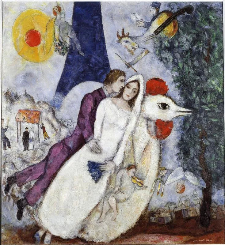 马克·夏加尔《埃菲尔铁塔上的新娘和新郎》,1938-1939,图片来源:蓬皮杜艺术中心