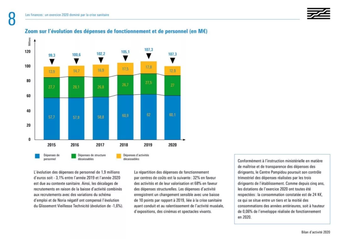 据官方年度报告显示,2020年蓬皮杜运营收入及投资总计2760万欧元,接受补助9680万元欧元。虽然暂无数据显示每年蓬皮杜用于购置藏品的具体金额,但可以看到,扣除人事及举办活动的开支,近五年蓬皮杜艺术中心的年均运营支出在2700万欧元左右,合理推测藏品购置支出也在该范围内。