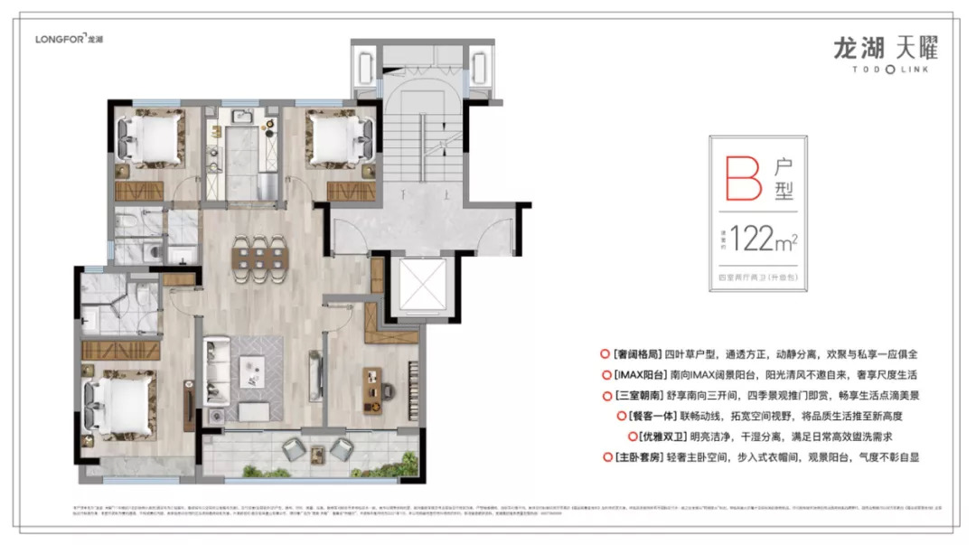 该户型整体方正,南北通透,270°阔景阳台,厨房餐厅一体化,超大主卧空间,尽享品质生活。