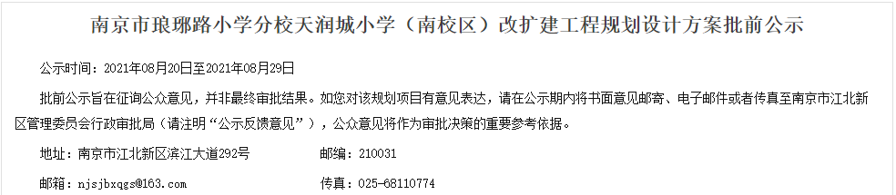 江北新区官网显示,琅琊路小学分校天润城小学即将扩建,这对附近的业主来说也是一大好消息。