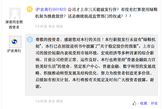 因此,有投资者在上证e互动平台上咨询沪农商行董秘是否有打算使用绿鞋机制挽救股价。但事实上沪农商行并没有设置“绿鞋机制”。