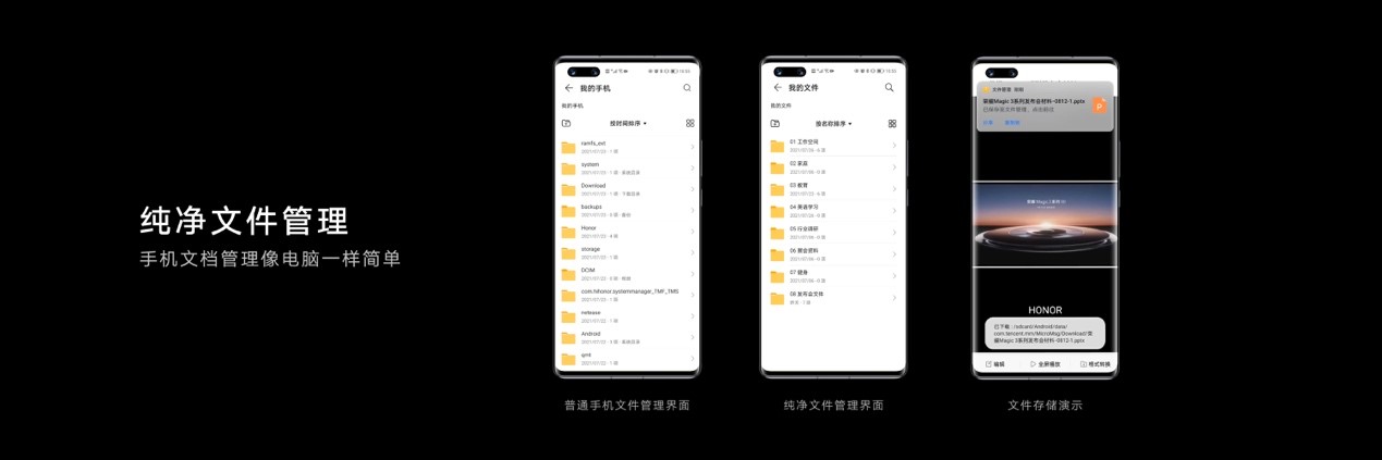 此外,荣耀Magic3系列还有许多特色功能。例如,纯净文件管理系统,使荣耀Magic3系列在文件保存和管理方面进行进一步简化,让手机文件管理从此可以像电脑一样简单便捷。