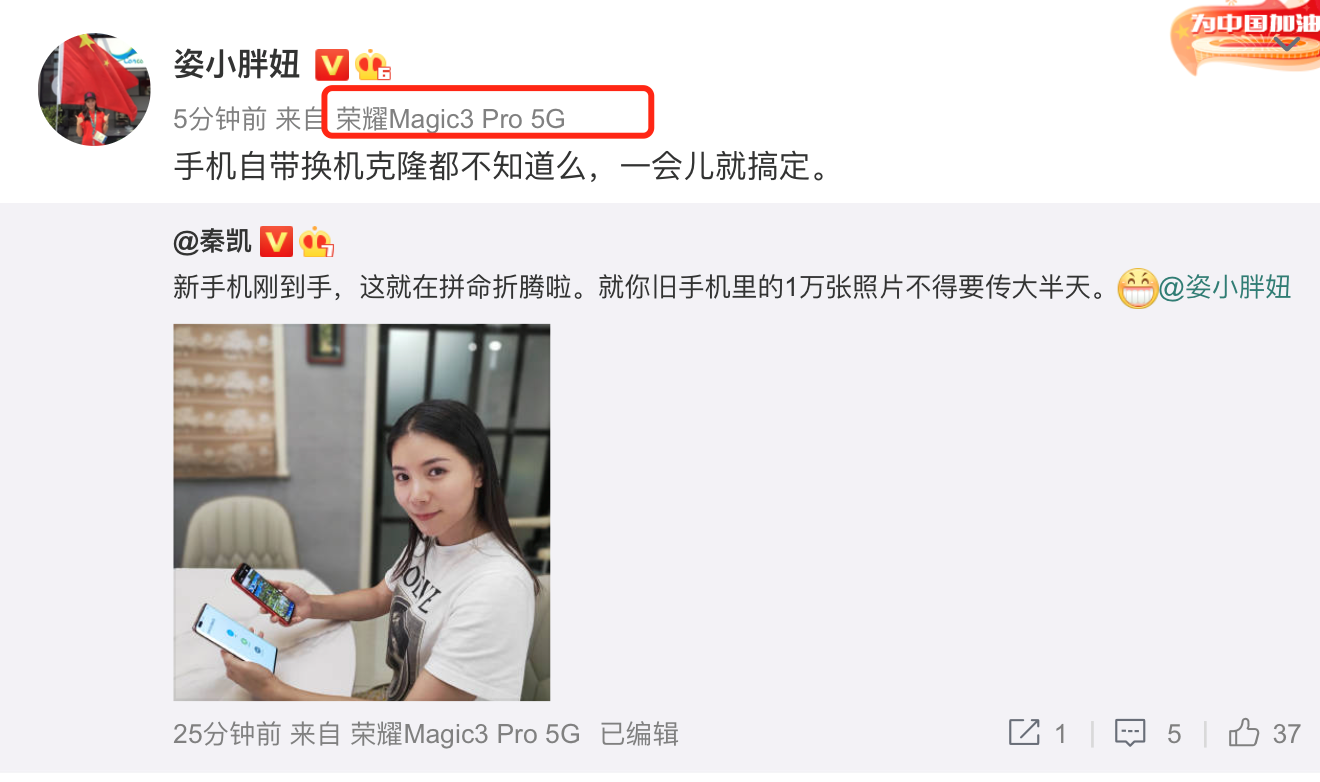 自首销以来,荣耀Magic3系列就成为高端手机市场上炙手可热的机型,备受用户欢迎。通过微博“小尾巴”可以看出,奥运冠军陈若琳、CBA辽宁队教练杨鸣、知名法医师、《法医秦明》系列小说作者秦明,都已经将手机换成了荣耀Magic3 至臻版。