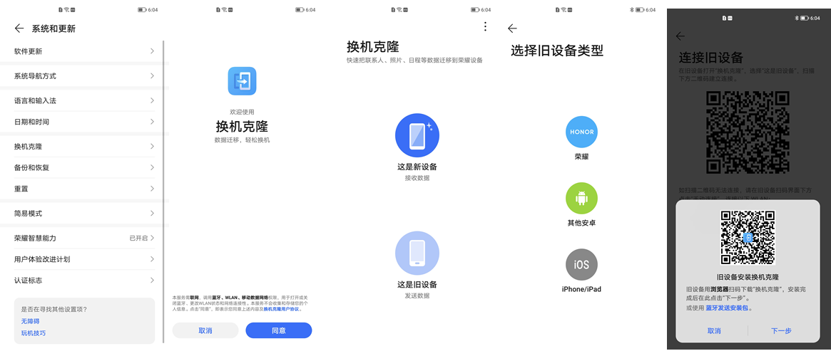 如果旧手机是荣耀手机,那么通过【设置】-【系统和更新】-【换机克隆】,选择“旧设备”;如果旧手机是华为手机,找到【手机克隆】功能。在新手机也就是荣耀Magic3系列的【换机克隆】功能页,选择“新设备”,并选择旧设备类型。