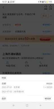 最近有媒体报道,一名游客通过美团平台预定了上海外滩W酒店的一间客房,房型显示为46平方米的外滩景观壮美客房,价格9559元一晚。