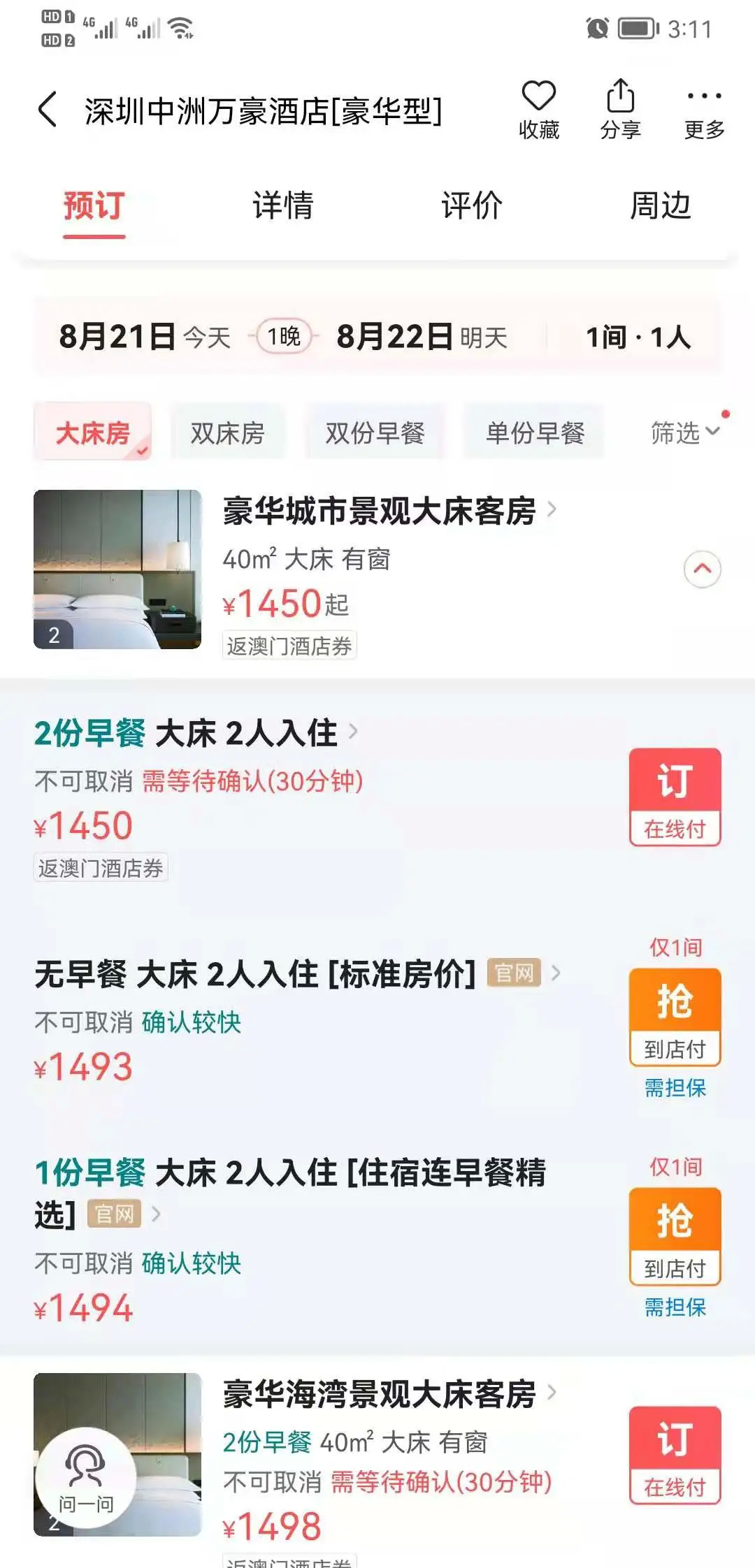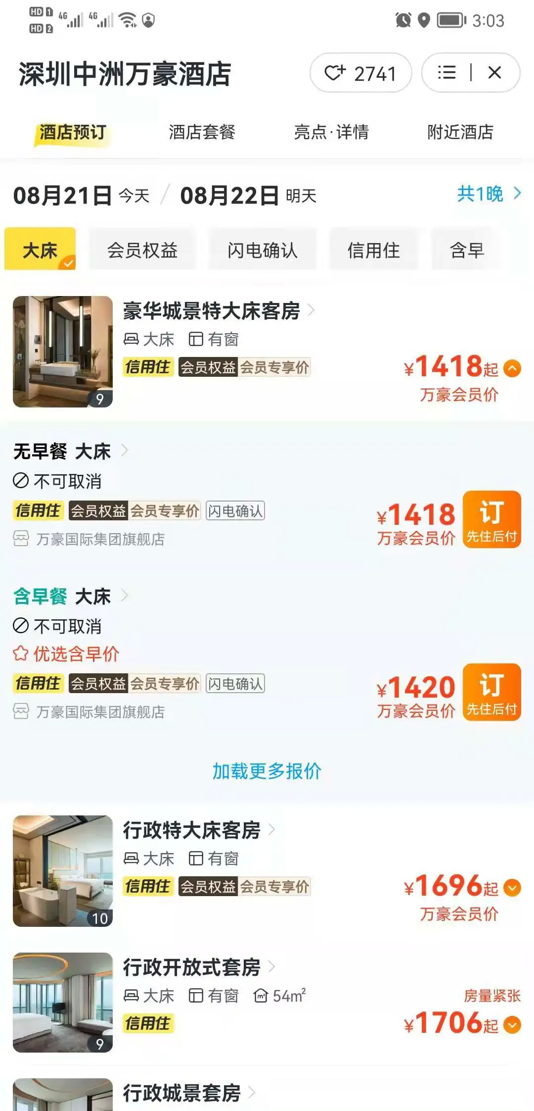 而在飞猪平台,该房型无早餐价为1418元,含早餐为1420元;与此同时,美团的价格则是1450元上下。