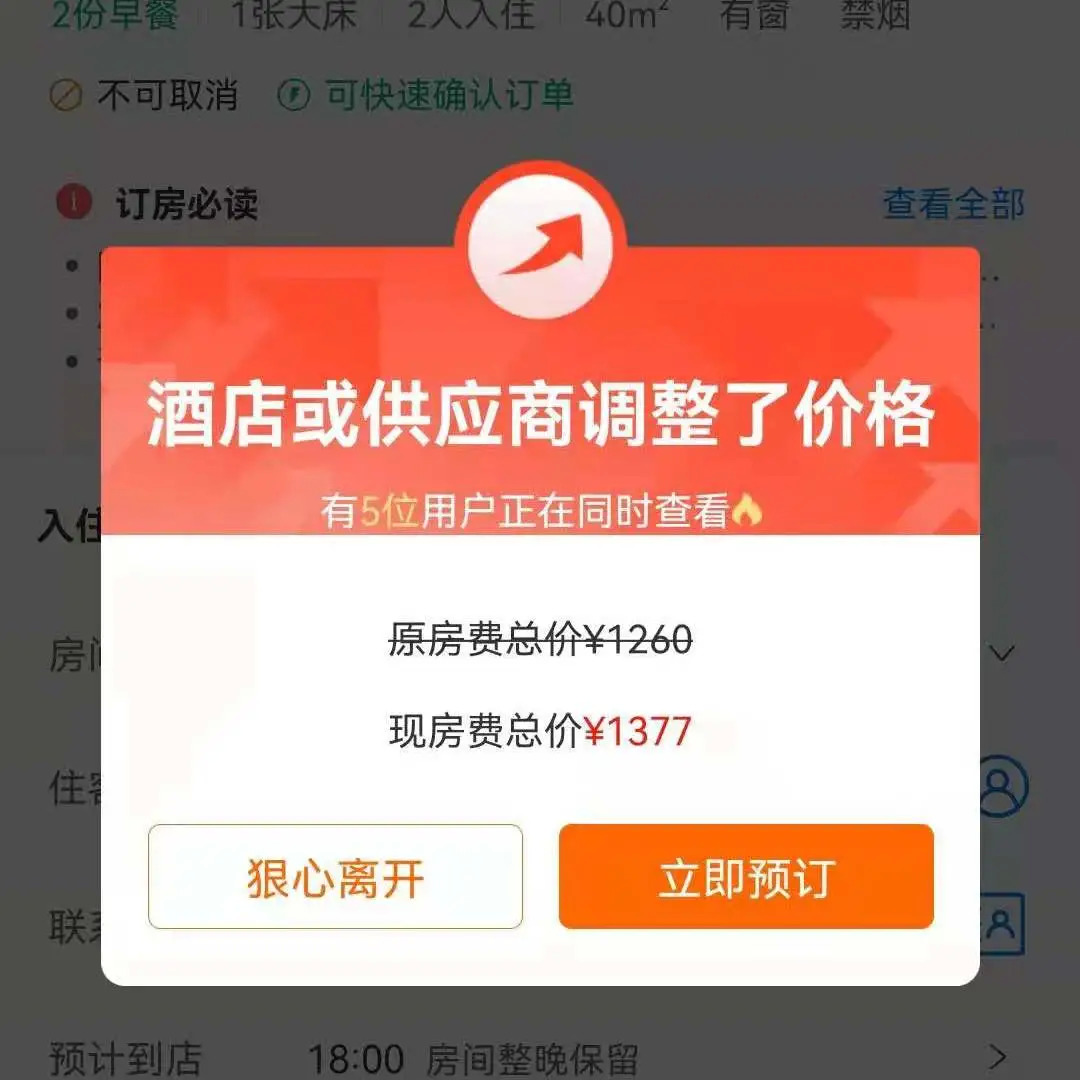 我们先来看用携程搜索“深圳中洲万豪酒店”,房型选择了豪华城市景观大床房,进入酒店首个页面显示价格为1260元,点进去以后发现价格立即有了变化,显示为1377元;2分钟后再查看该房型,价格则变成1494元,并且标明“酒店或供应商调整了价格”。