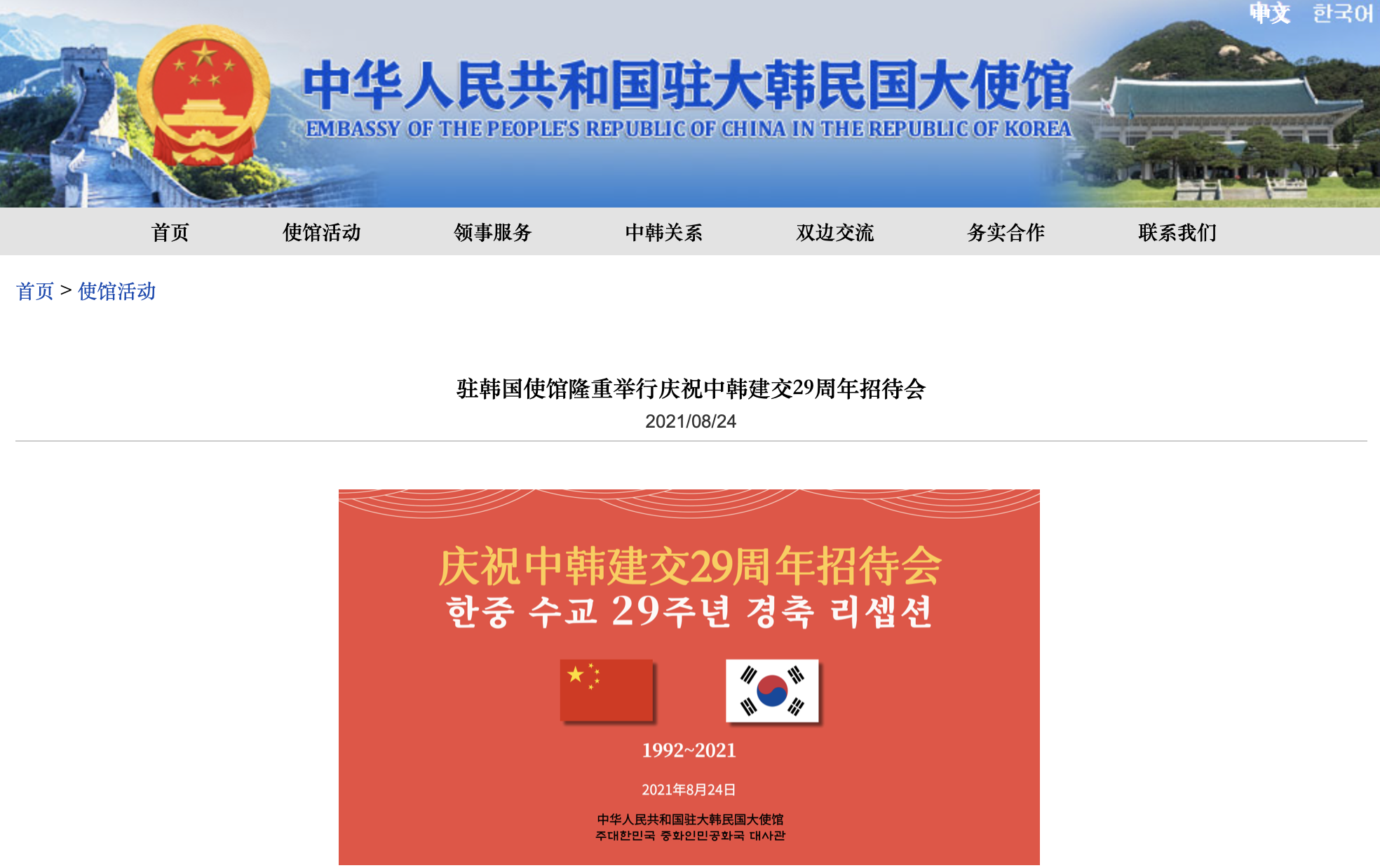 据中国驻韩国大使馆网站消息,8月24日中韩建交29周年之际,驻韩国使馆以线上线下相结合的方式隆重举行庆祝招待会。邢海明大使和使馆主要外交官在使馆主会场出席,李肇星前外长、全国政协外事委员会副主任韩方明和韩国外交部经济外交调整官李诚浩、联合国前秘书长潘基文、前议长文喜相、前外长金星焕、前驻华大使权丙铉、前总统卢泰愚之子卢载宪在线或视频致辞。