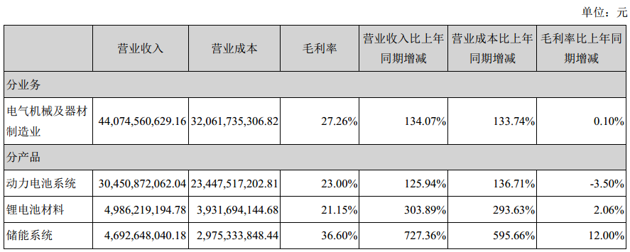 报告期内,受新能源车市场需求拉动,宁德时代动力电池系统销售收入为304.51亿元,同比增长125.94%;同时,公司实现储能系统销售收入46.93亿元,同比增长727.36%;此外,受下游锂电池需求拉动,公司锂电池材料销售收入为49.86亿元,同比增长303.89%。
